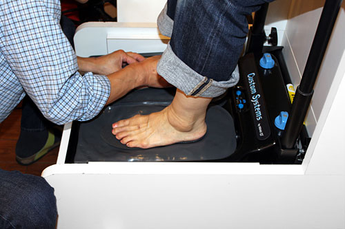 足形を取るフットプリントを使い、足の輪郭と重心のかかり具合を検査します。そして足回りとつま先からかかとまでの長さを測り全体の状態を診断します。