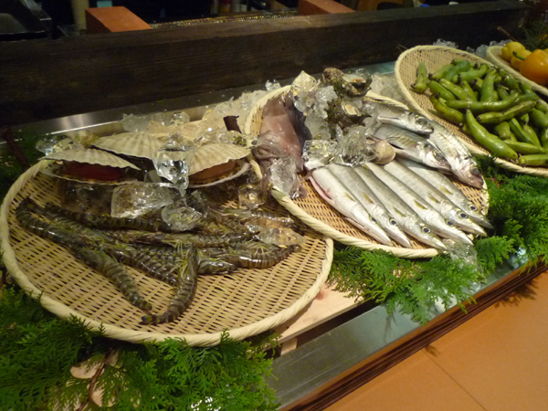 「炉端焼き」コーナーでは、旬な野菜や魚介を目の前で焼いて頂き、大きなしゃもじで運んで頂きます。