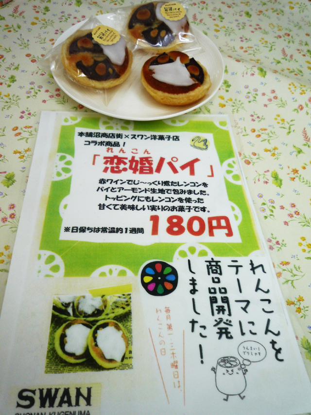現在、商店街活性化の一環として、本鵠沼商店街全体で活動をされている「本鵠沼はす池通り物語」に参加されているそうです。この活動は、鵠沼らしい自然の一つである「蓮池(はすいけ)」の環境保全の一環とした取り組みで、プロジェクト参加店舗毎に「蓮池(はすいけ)にちなみ、「れんこん」をテーマにしたオリジナルメニューを開発されていて、スワン洋菓子店様では「恋婚(れんこん)パイ」(1個180円)
