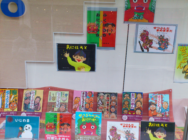 また、節分に関する絵本もいろいろと用意し、こちらはショーウィンドウにも飾ってあります。かわいい表紙の絵本を取り揃えておりますので、是非見にいらしてください。