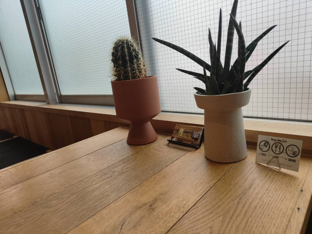 木材を多く活用した家具に観葉植物などリラックスして仕事に集中できる環境です。